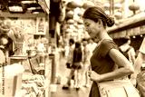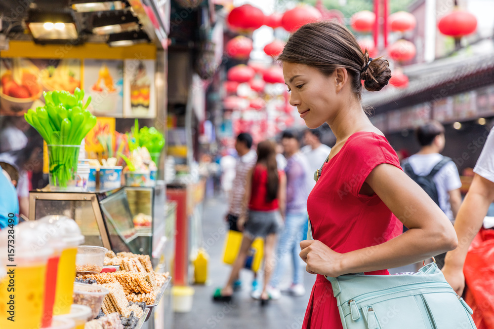 Woman tourist at chinese market Wangfujing, food street on Asia travel. Traditional Beijing snacks at outdoor market place. Asian woman looking at restaurant or outside store.