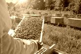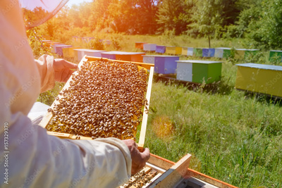 Beekeeper is working with bees and beehives on the apiary. Apiculture.