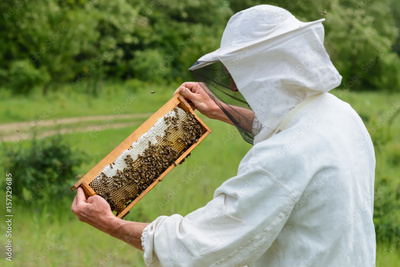 The beekeeper takes out from the hive honeycomb filled with fresh honey. Apiculture.