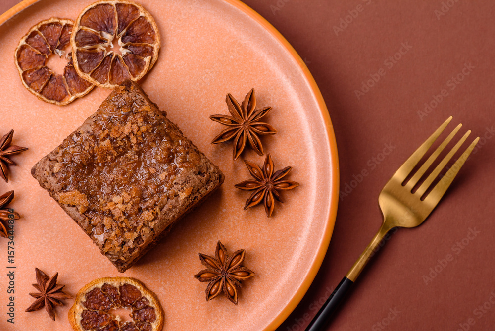 Chocolate brownie cake, food, sweet dessert with nuts rectangular shape. Sweet chocolate brownie