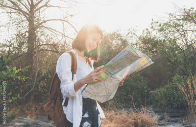 Soft focus of woman traveler with backpack checks map to find Path is a goal. vintage tone