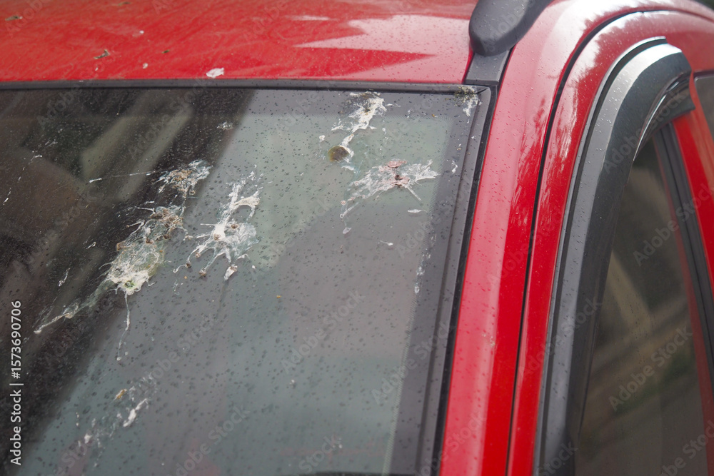 Bird droppings cover red car in urban environment