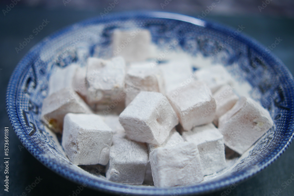Turkish delight squares in a festive bowl
