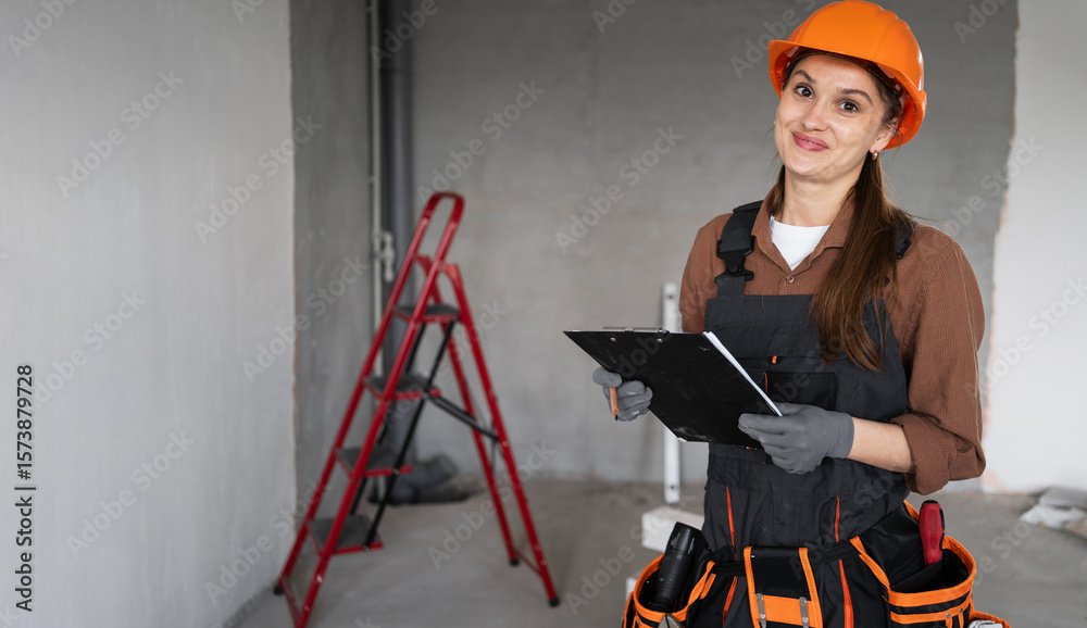 Portrait of Female Construction Worker Holding Clipboard at Building Site Looking at Camera