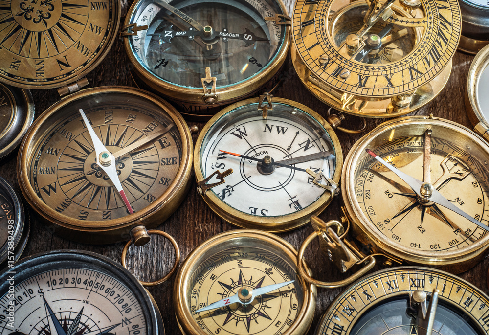 Old compass collection on vintage wood. Exploration and nautical theme grunge background.