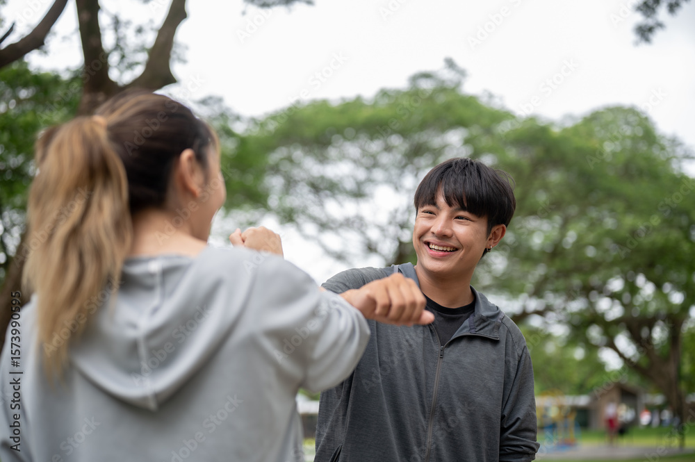 Asian man and woman in sportswear smiling as elbow bumping together after running or jogging in park
