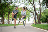 Asian man and woman in sportswear holding a knee stretching together as standing on pavement in park