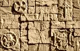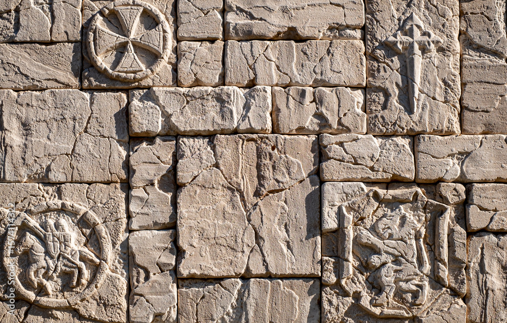 A close-up shot of a textured stone wall made of rectangular bricks, giving it a rugged, worn-out look. The sunlight casts soft shadows, adding depth and a three-dimensional vibe.