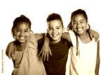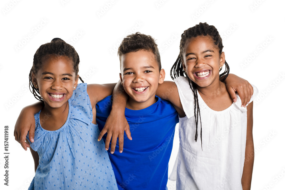 portrait of happy three black childrens, white background
