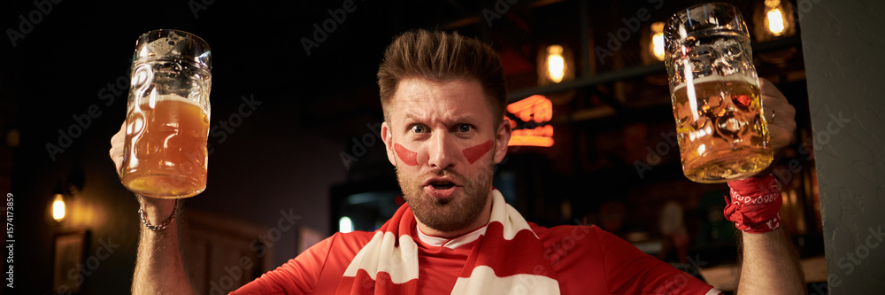 Header portrait of Caucasian young man with red face paint holding two large beer mugs, wearing sports scarf and wristband, celebrating soccer match in bar, looking directly at camera