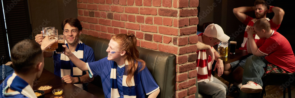 Header of group of young adlt multiethnic soccer fans sitting in sports bar cheering and toasting with beer, some wearing face paint and jerseys, others talking and watching match together