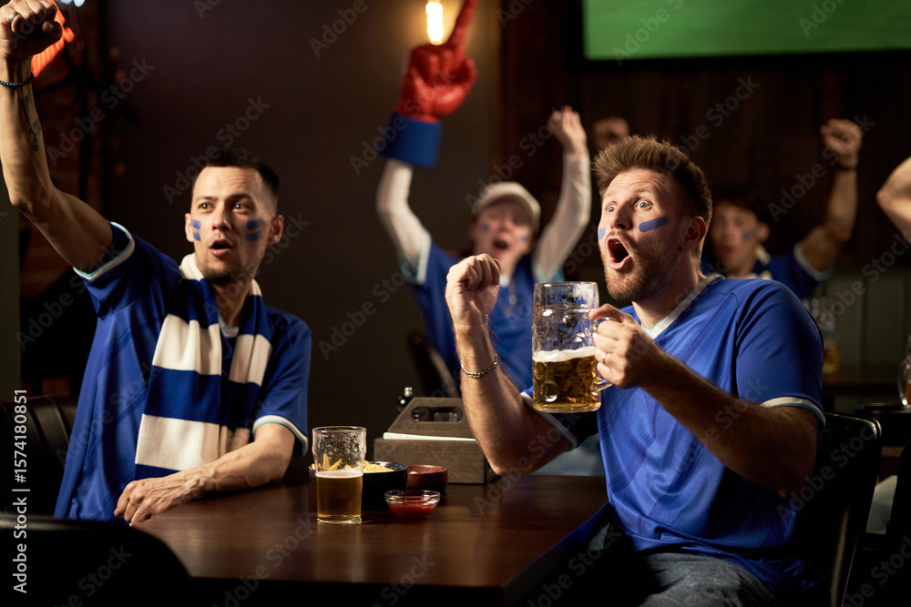Group of Caucasian young men wearing face paint cheering and celebrating while watching soccer match in sports bar, fans holding drinks and raising arms in excitement