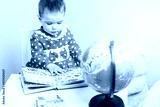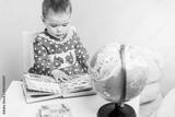 A one-year-old girl in a red dress is sitting at a table with a book, a globe and a teddy bear.