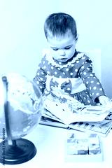 A one-year-old girl in a red dress is sitting at a table with a book, a globe and a teddy bear.