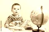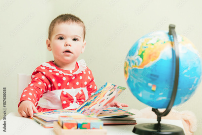 A one-year-old girl in a red dress is sitting at a table with a book, a globe and a teddy bear.