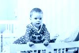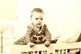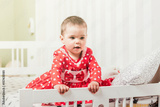 A one-year-old girl in a red dress is sitting on a bed in a room
