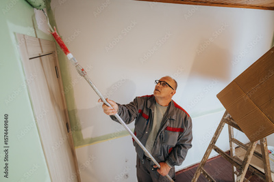 A person engages in redecorating by painting a wall green using a roller brush. The image highlights the concept of home improvement and self-renovation during household activities.