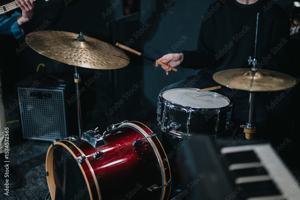 A close-up view of a drummer playing during a live music performance, highlighting drum set details and cymbals for a rhythmic, artistic vibe.