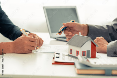 The real estate agent discussed the terms of the home purchase contract and asked the client to sign the document to legally complete the contract.