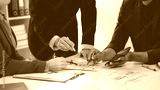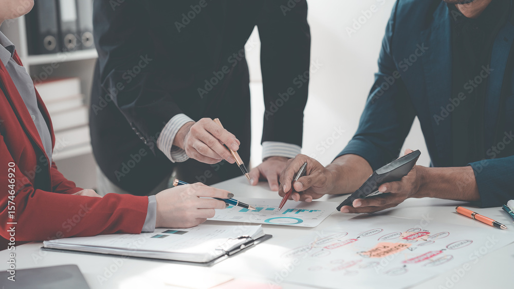 Business people discussing, there are financial charts and graphs on the table, discussing about charts and graphs showing the results of successful teamwork.