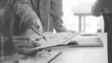 Business people discussing, there are financial charts and graphs on the table, discussing about charts and graphs showing the results of successful teamwork.