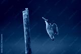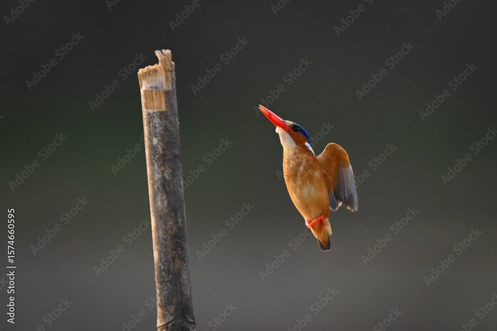 Malachite kingfisher flies up to bamboo post