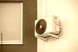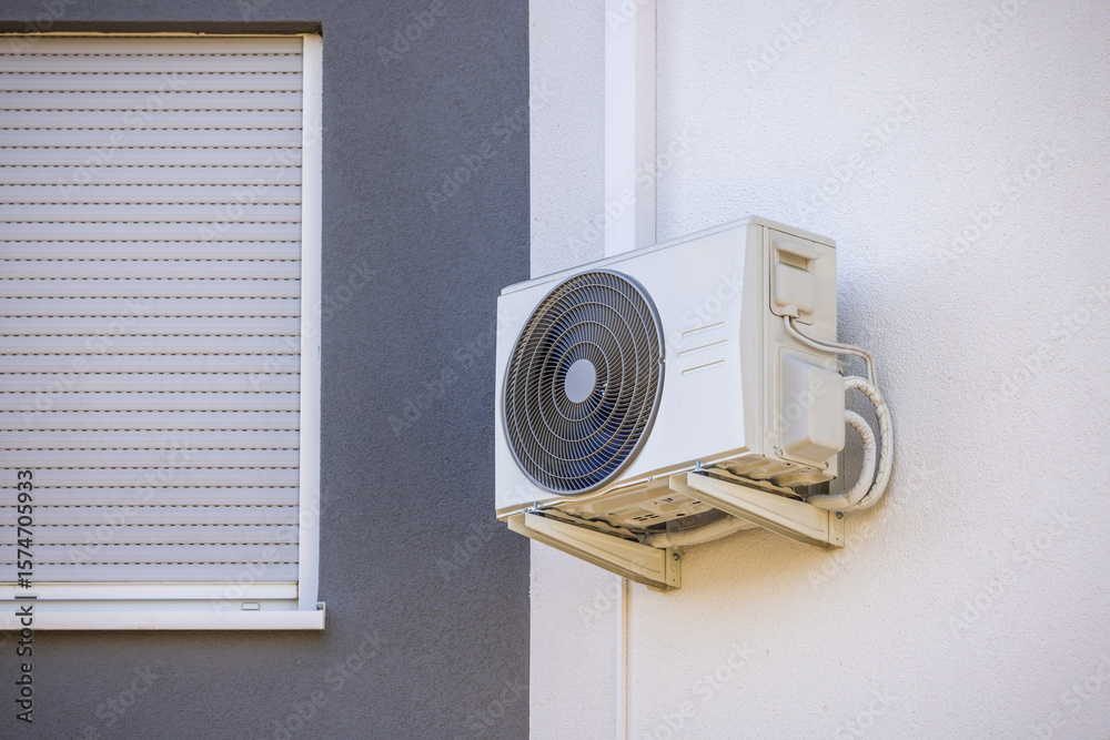 Air conditioner and heat pump installed on a wall of family house, split system unit
