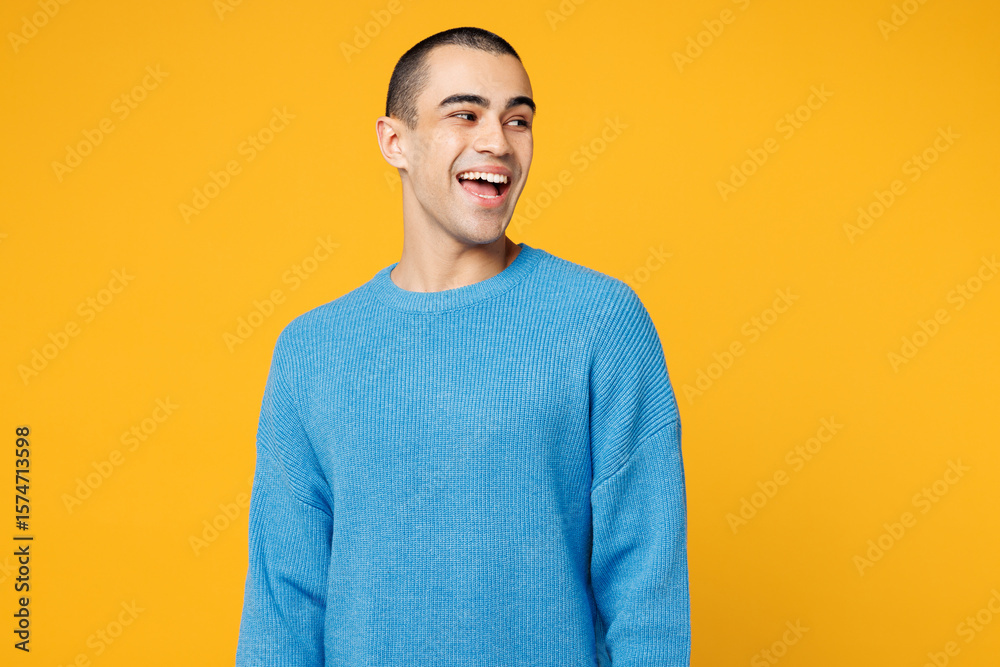Young shocked surprised fun happy middle eastern man wearing blue sweatshirt casual clothes looking aside on area mock up isolated on plain yellow orange background studio portrait. Lifestyle concept.