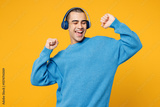Young fun middle eastern man wearing blue sweatshirt casual clothes listening to music in headphones raise up hands dance isolated on plain yellow orange background studio portrait. Lifestyle concept.