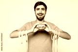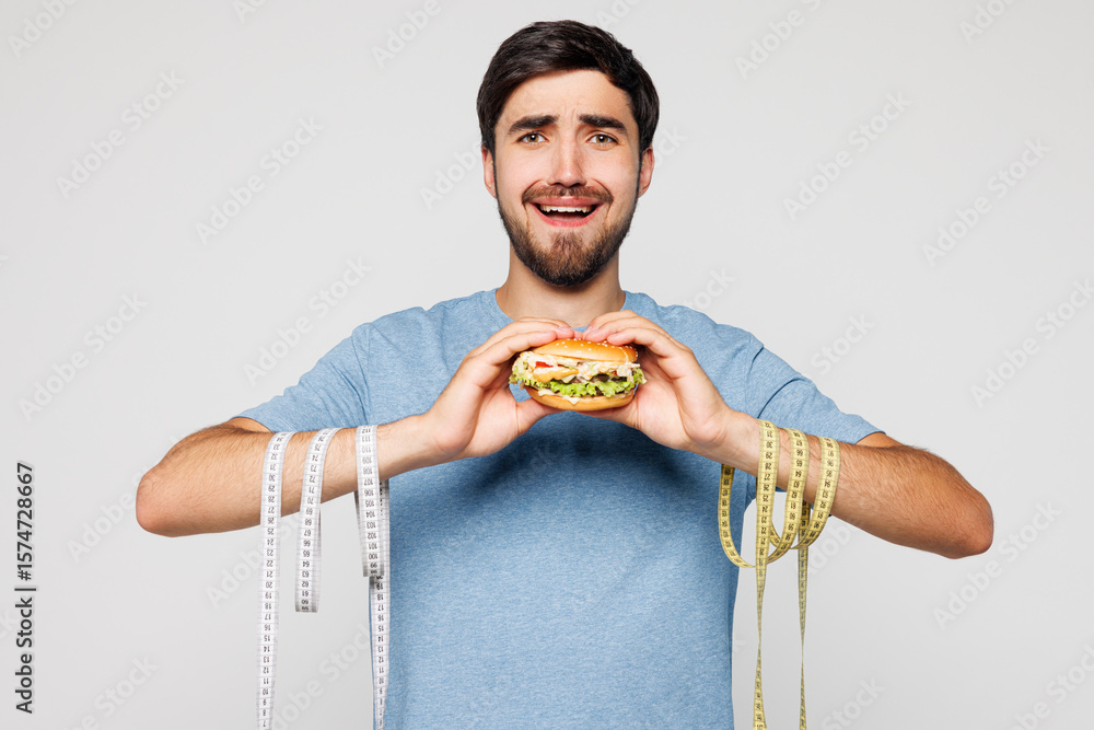 Young shocked sad man wears blue t-shirt casual clothes, tied hands with measure tape hold eat burger isolated on plain solid white background. Proper nutrition healthy food unhealthy choice concept.