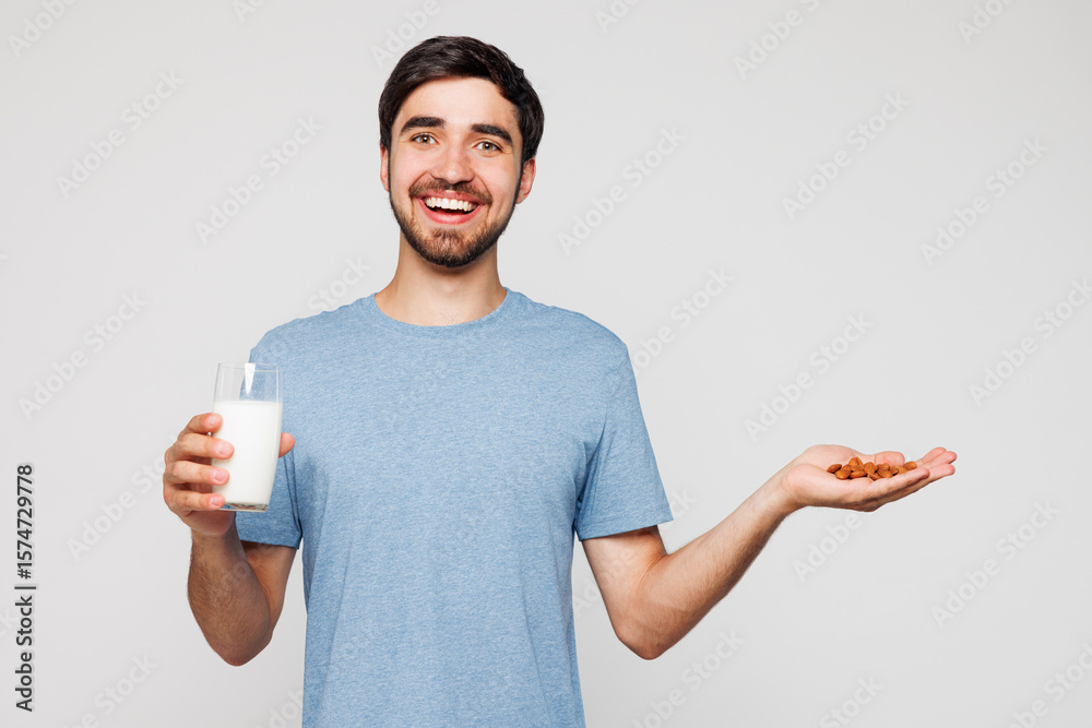 Young smiling happy cheerful man wear blue t-shirt casual clothes drink almond milk hold nuts in palm isolated on plain solid white background. Proper nutrition healthy food unhealthy choice concept.