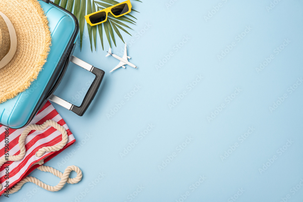 Travel essentials such as a suitcase and summer accessories with a tropical vacation theme