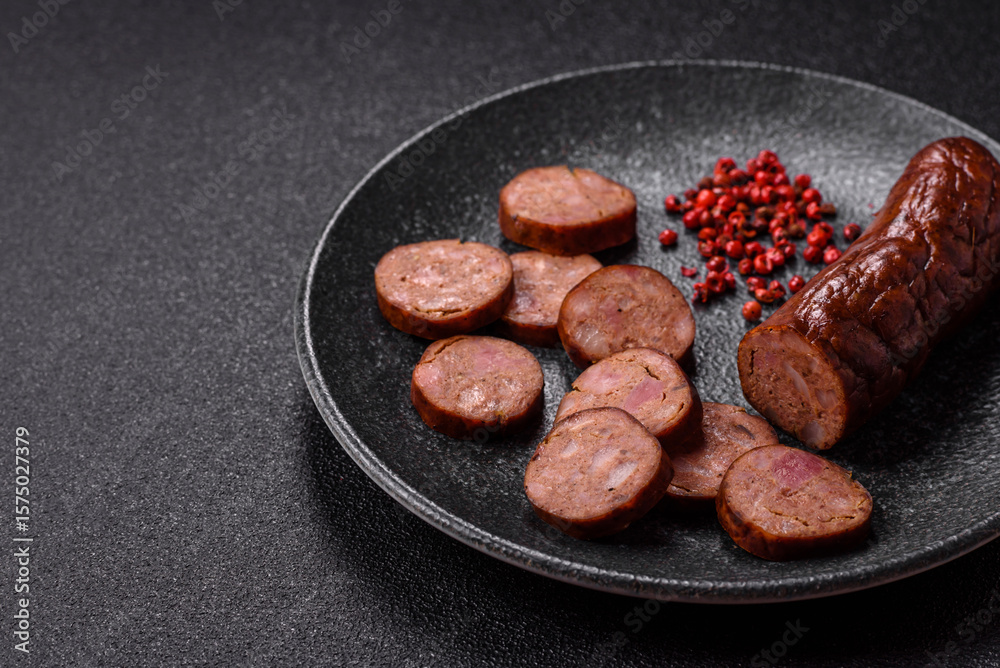 Homemade meat or vegan sausage grilled with spices. Homemade sausage cooked on barbecue