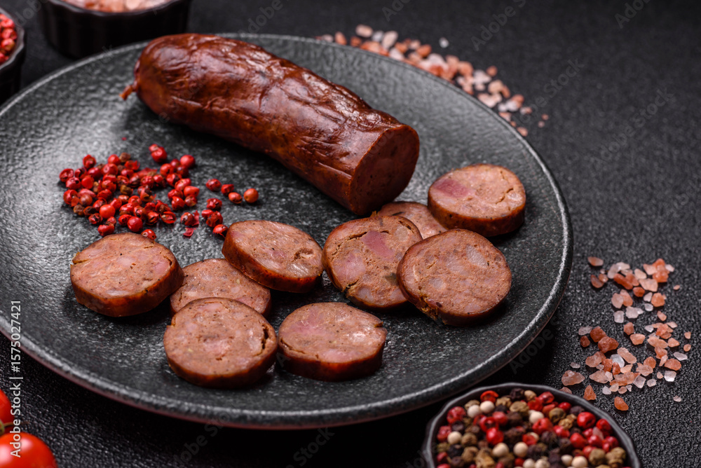 Homemade meat or vegan sausage grilled with spices. Homemade sausage cooked on barbecue