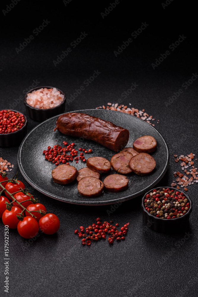 Homemade meat or vegan sausage grilled with spices. Homemade sausage cooked on barbecue