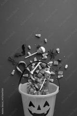 An orange vertical pumpkin bucket filled with colorful Halloween candies and decorations scattered on a purple background. Perfect to represent Halloween celebrations, trick-or-treating