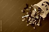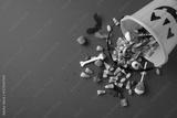 Orange pumpkin bucket with various colorful candies spread out on a purple surface