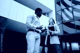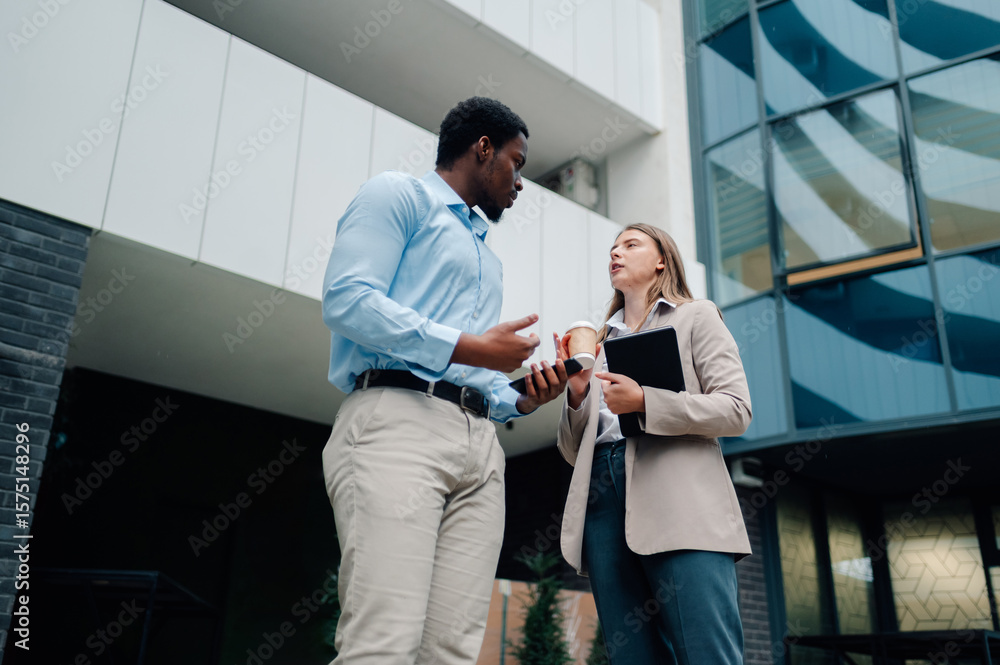 Business people discussing work outside office building