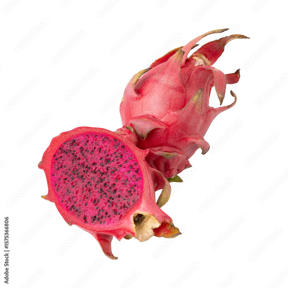 Whole and sliced red fleshed dragon fruit Isolated on transparent background