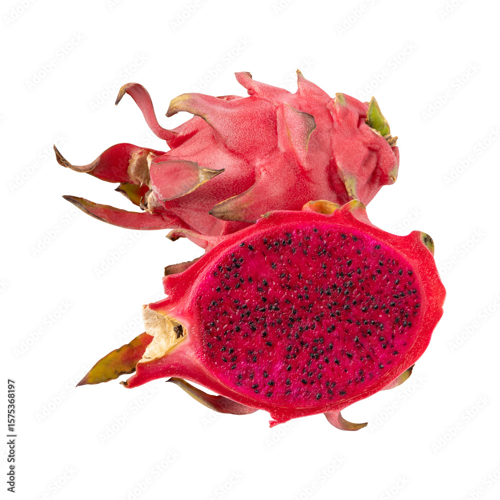 Whole and sliced red fleshed dragon fruit Isolated on transparent background
