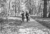 Back view of two people walking on a sunny park path, one with a yoga mat. Outdoor leisure in nature.