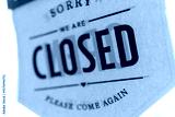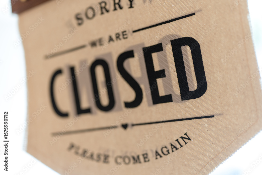 A sign hanging off coffee shop door. Close sign blur background. Label word close