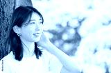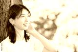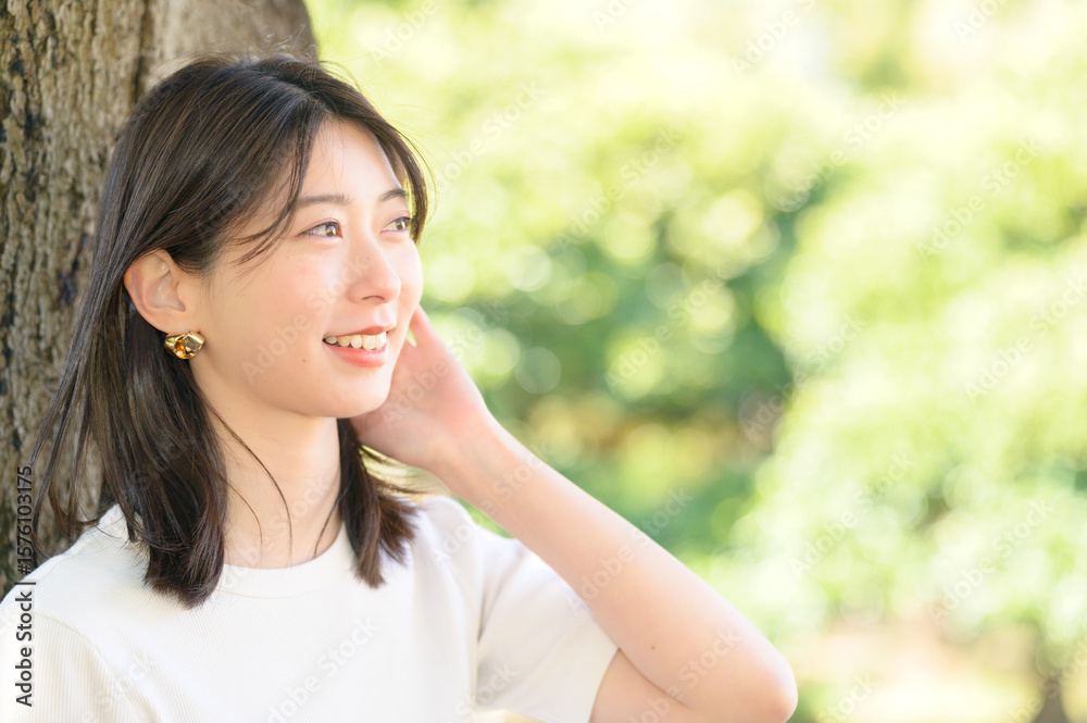 公園で微笑む半袖を着た日本人女性