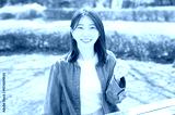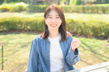 公園でガッツポーズをする日本人女性