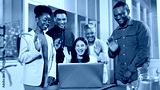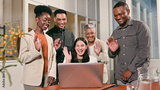 Group of Colleagues Smiling and Waving During a Virtual Business Meeting in a Modern Office