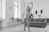 Full length portrait of senior woman wearing sportswear standing in living room at home exercising on carpet. Mature elderly female person doing sport exercise. Retirement and fitness concept.