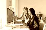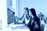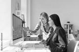 Two successful women analyzing financial details and looking through digital file on PC, posing at office desk, working together as team. Female accountants checking electronic spreadsheet