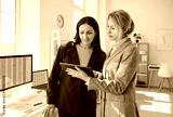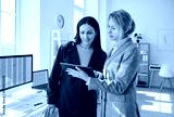 Two confident businesswomen discussing data on tablet in office. Female colleagues analyzing financial report or team project together while standing near desk with spreadsheet on computer screen.
