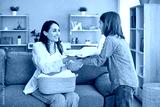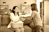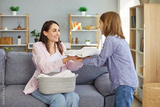 Beautiful young woman and child boy sitting on sofa in the living room at home with a basket of fresh clen clothes. Son helping cheerful mother doing laundry. Family housework and household concept.