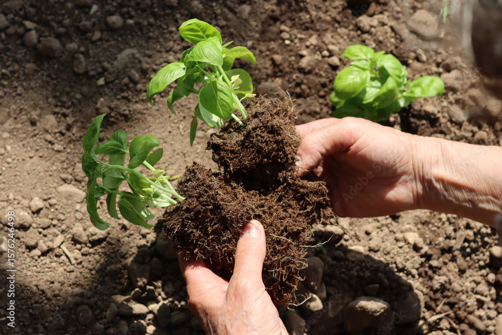 Detail of female hands transplanting basil plants in the vegetable garden. Ocimum basilicum